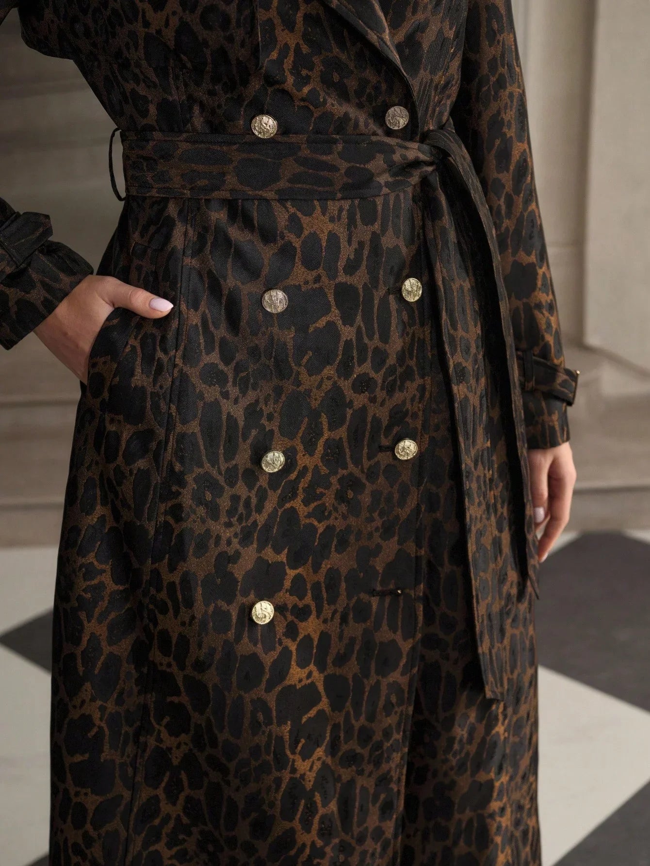 Stampa leopardata senza tempo Il trench con cintura in vita crea una silhouette raffinata. La patta e il colletto doppiopetto aggiungono un tocco classico a una vestibilità moderna e rilassata. La stampa all-over dona un tocco di stile eleganza senza tempo E lusso tranquillo, perfetto per stile vecchio stile Applicazioni in stile minimalista. Il corpo è sfoderato per facilitare la sovrapposizione, mentre la cintura in vita definisce la silhouette con naturalezza e raffinatezza.